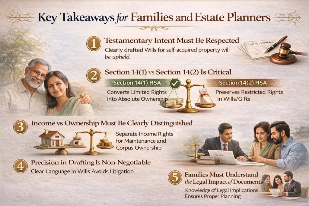 This judgment strikes a careful balance between women’s socio-economic protection and testamentary freedom. It reinforces that widow’s rights under the Hindu Succession Act are shaped entirely by how they are documented — and that the life estate vs absolute ownership distinction under Section 14 HSA is not a technicality but a foundational legal principle.